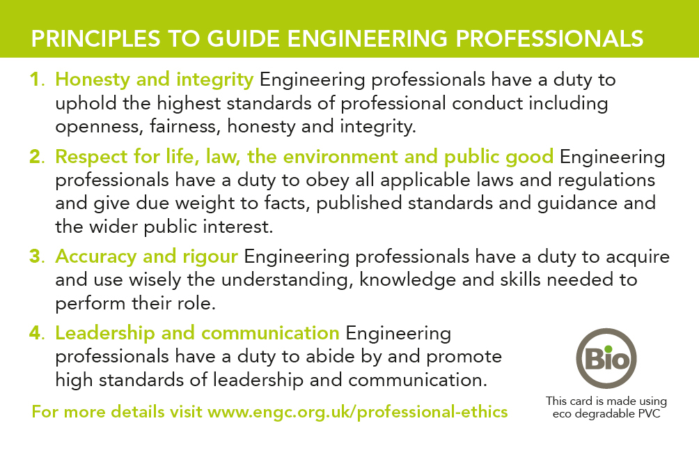 Engineering professionals have a duty to obey all applicable laws and regulations and give due weight to facts, published standards and guidance and the wider public interest.